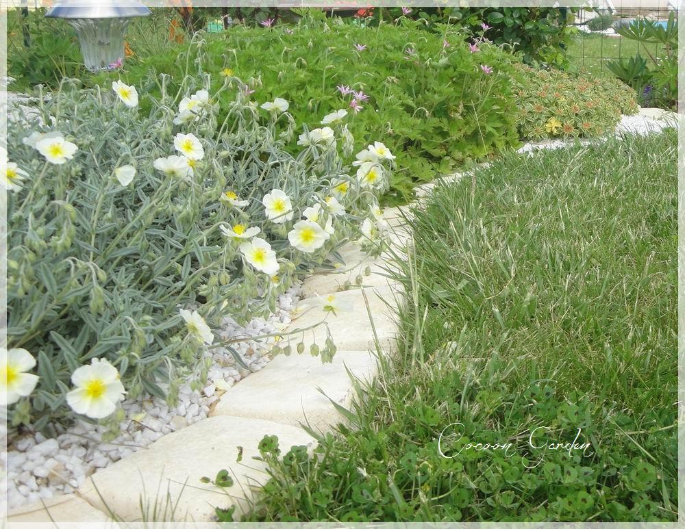 Le coussin d'hélianthème 'The Bride' est couvert de fleurs blanches. Derrière lui, le géranium 'Endresii' et enfin le sedum 'Kamtschatka panaché' qui eux aussi ont bien prospéré depuis l'année dernière :-)